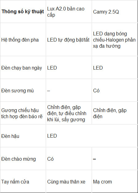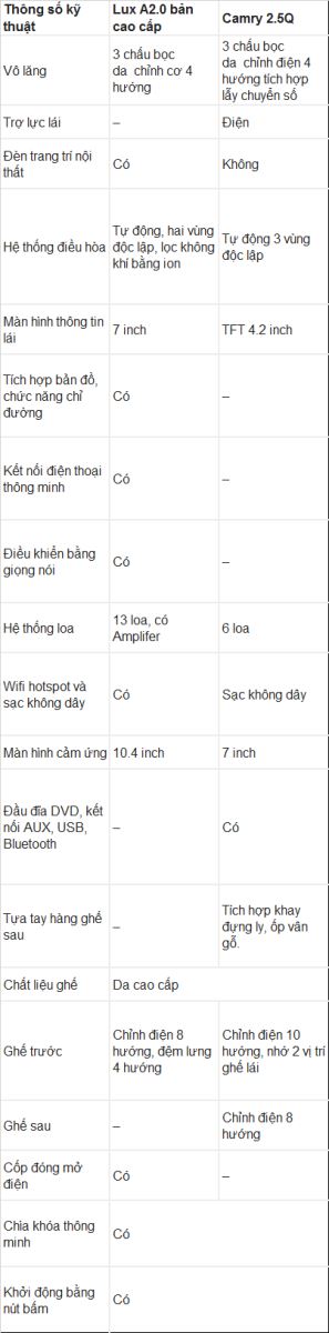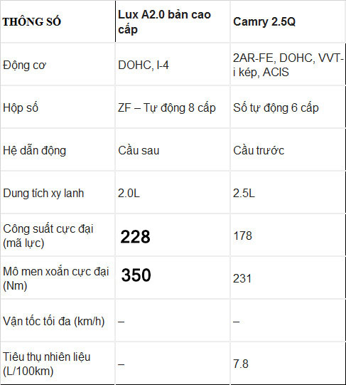 So sánh thông số kỹ thuật VinFast Lux A2.0 và Toyota Camry 2.5Q