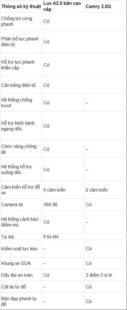 So sánh tính năng an toàn VinFast Lux A2.0 và Toyota Camry 2.5Q