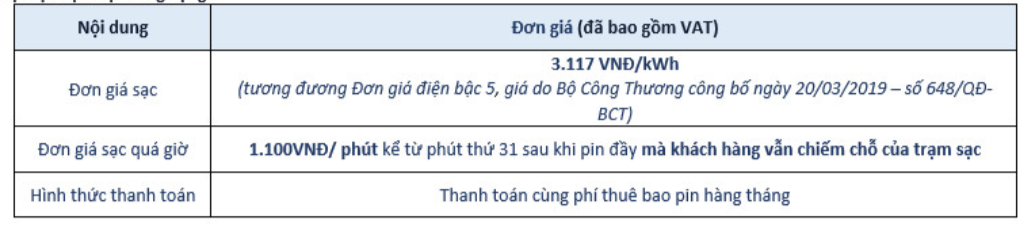 Đơn giá sạc quá giờ 1.100VNĐ/ phút kể từ phút thứ 31 sau khi pin đầy mà khách hàng vẫn chiếm chỗ của trạm sạc.