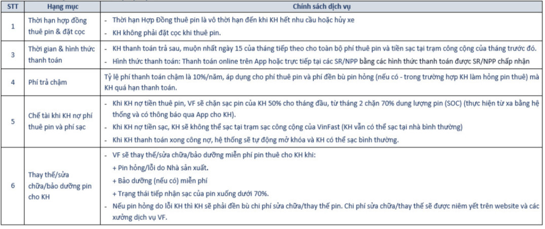 - KH thanh toán trả sau, muộn nhất ngày 15 của tháng tiếp theo cho toàn bộ phí thuê pin và tiền sạc tại trạm công cộng của tháng