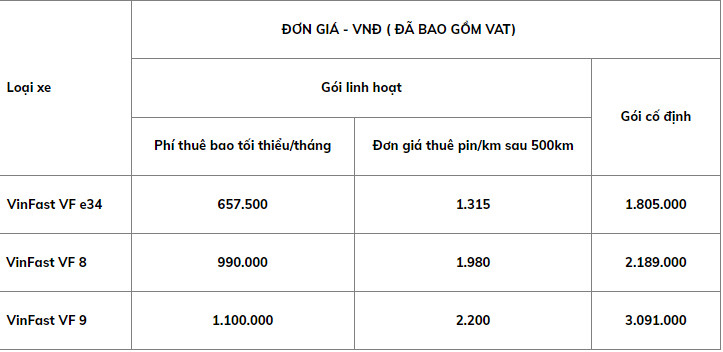 Gói thuê pin linh hoạt: Chỉ từ 657.500 VNĐ/tháng cho quãng đường tối đa 500km/tháng. Trường hợp đi quá 500 km/tháng, khách hàng sẽ trả thêm phí thuê pin theo đơn giá chỉ từ 1.315 VNĐ/km vượt.