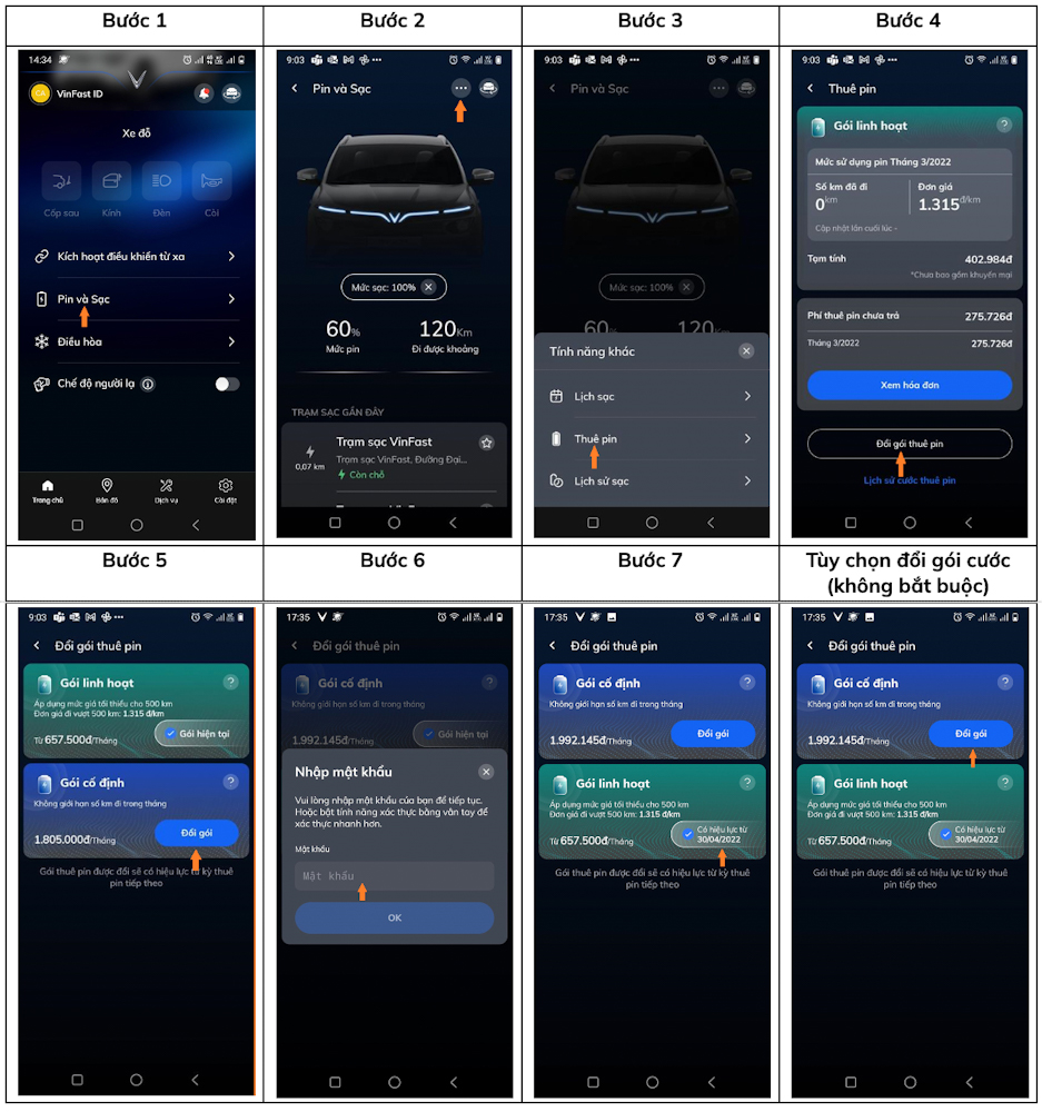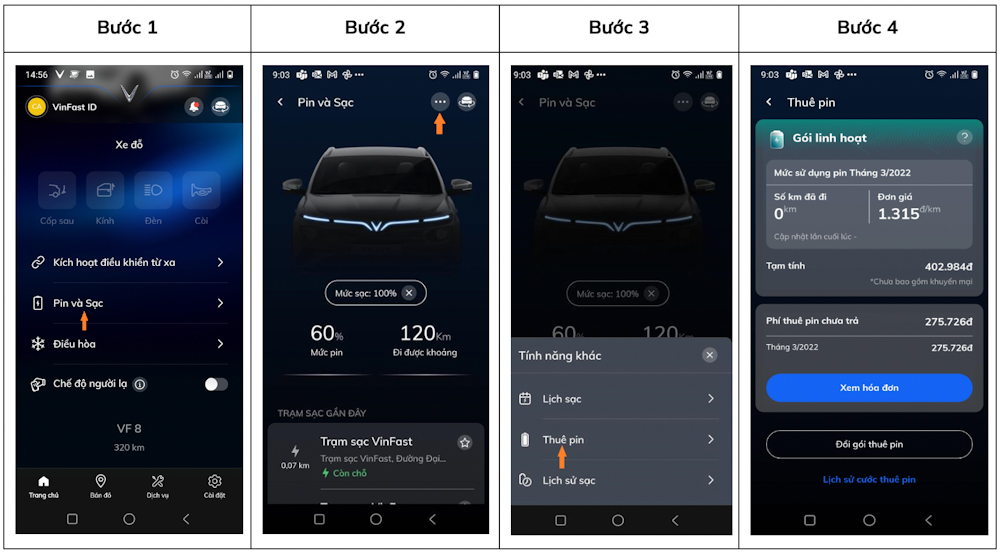 Việc thanh toán chi phí thuê pin hàng tháng hoặc sạc điện tại trạm được thực hiện dễ dàng thông qua giao dịch trên điện thoại di động. Khách hàng cần kết nối ứng dụng với tài khoản mobile banking hoặc thẻ tín dụng hiện có để tiến hành chuyển khoản. Việc trả phí sạc có thể thực hiện ngay khi việc sạc kết thúc hoặc thanh toán 1 lần (muộn nhất) vào ngày 15 của tháng tiếp theo cho toàn bộ phí dịch vụ của tháng trước đó.