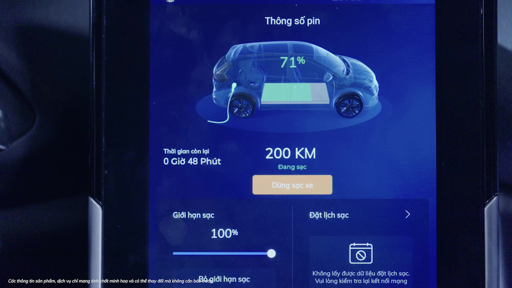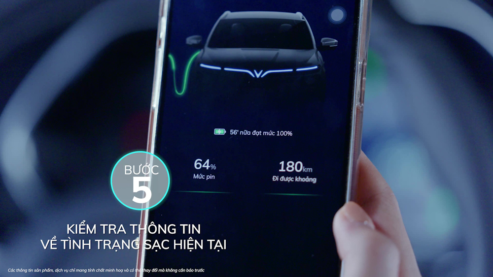 Bước 4: Khách hàng có thể kiểm tra các thông số hiện tại về tình trạng sạc và thông số sạc (trạng thái nhận sạc, mức pin, quãng đường có thể di chuyển với tương ứng với mức pin, thời gian còn lại để sạc đầy 100%...) hiển thị trên ứng dụng VinFast, màn hình MHU trên xe hoặc trên màn hình của trụ sạc.